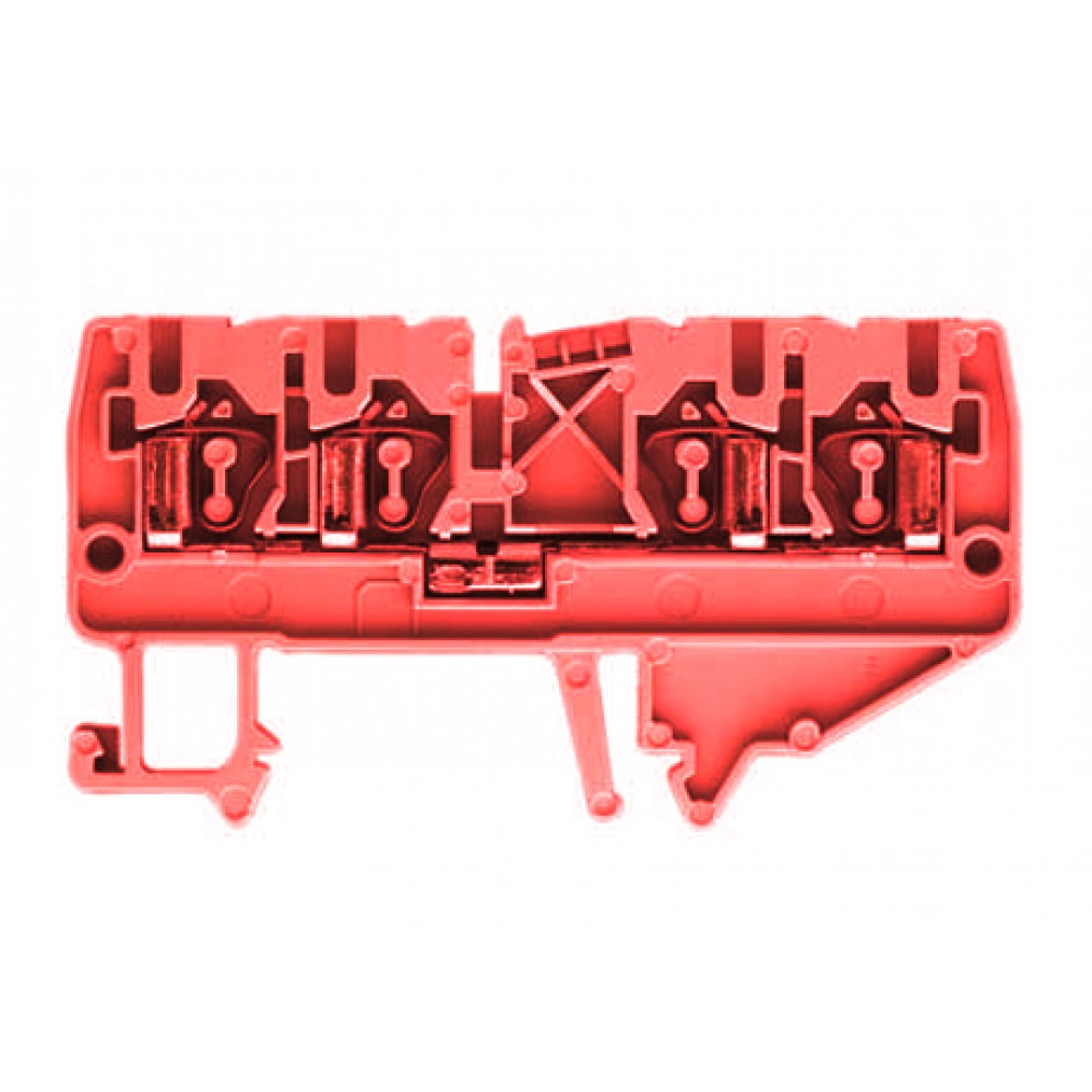 Проходная клемма, 4 точки подключения, тип фиксации провода: пружинный, номинальное сечение: 2,5 мм кв., 24A, 800V, ширина: 5 мм, цвет: красный, тип монтажа: DIN35