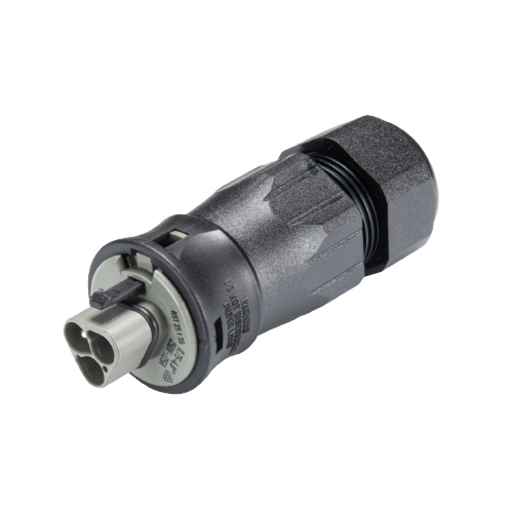 Вилочный разъем на кабель диаметром 13-18 мм, 3 полюса, тип фиксации провода: винтовой,номинальные характеристики: 250/400V, 25A, цвет корпуса: черный, цвет контактной вставки: серый, серия RST Classic