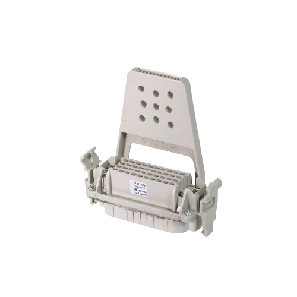 Вилочная контактная вставка, обжимная фиксация, 64 полюса + PE, типоразмер 24B, 250V, 10A, (обжимные контакты поставляются отдельно), с защелками, с разгрузкой от натяжения, с монтажной рамкой