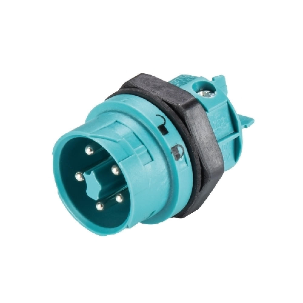 Вилочный разъем в панель RST16I5 S S1 M03 A TB, Вилочный разъем в панель, М20, 5 полюсов, тип фиксации провода: винтовой, номинальные характеристики: 250V, 16A, цвет корпуса: черный, цвет контактной вставки: бирюзовый, серия RST MINI