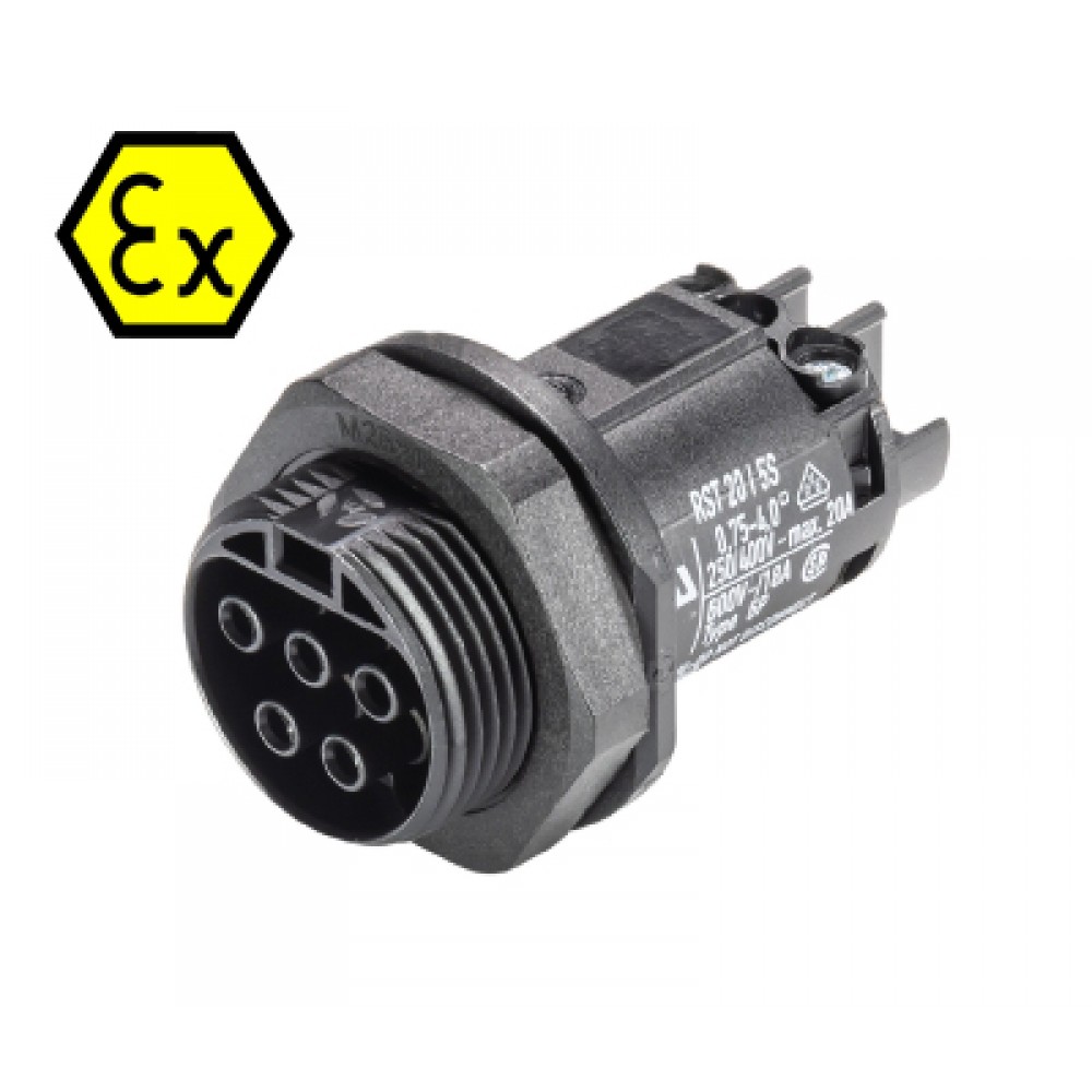 Разъём Female RST20I5SXB1 взрывозащита, Взрывозащищенный розеточный разъем в панель, М25, IP68(69k), 5 полюсов, винтовая фиксация провода, номинальные характеристики: 250/400V, 20A, цвет: черный, серия RST Ex
