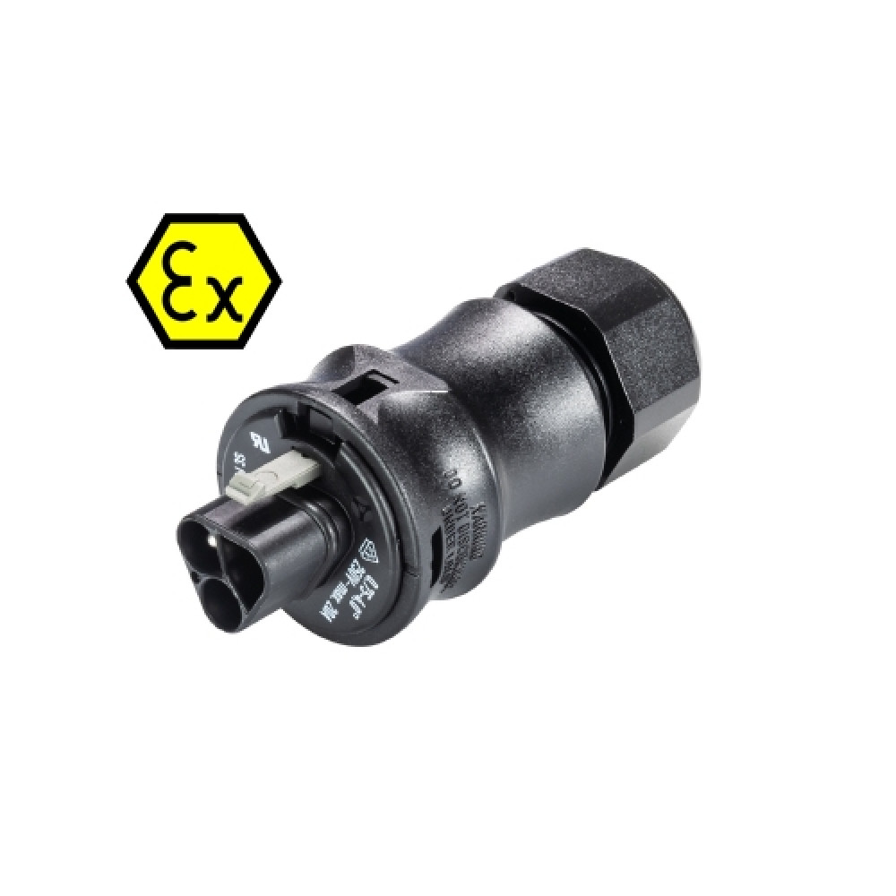 Взрывозащищенный вилочный разъем на кабель диам. 6-10 мм, IP68(69k), 3 полюса, пружинная фиксация провода, номинальные характеристики: 250V+РЕ, 20A, цвет: черный, серия RST Ex