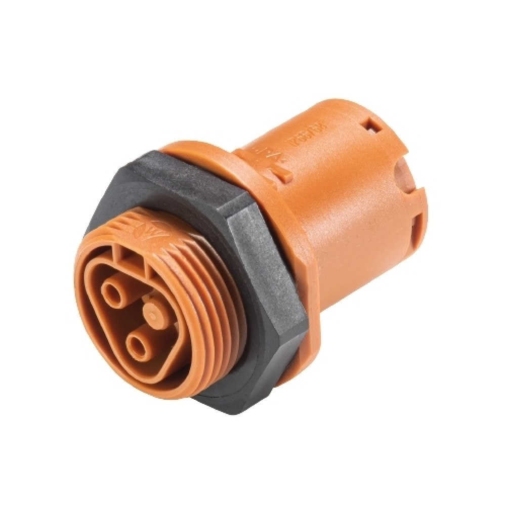 Розеточный разъем в панель RST20I2F B23 M00 L BR01, Розеточный разъем в панель, М25, 2 полюса, тип фиксации провода: пружинный, номинальные характеристики: ~50/120V, 20A, цвет гайки: черный, цвет контактной вставки: коричневый, серия RST Classic