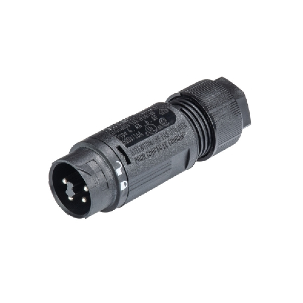 Вилочный разъем на кабель диаметром 7,1-13 мм, 4 полюсов, тип фиксации провода: винтовой, номинальные характеристики: 250/400V, 16A, цвет корпуса: черный, цвет контактной вставки: черный, серия RST MINI