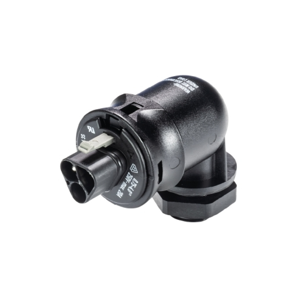 Вилочный разъем в панель RST20I3S S1 M90V SW, Вилочный разъем в панель, М20, 3 полюса, угловой 90 гр., тип фиксации провода: винтовой,номинальные характеристики: 250/400V, 20A, цвет корпуса: черный, цвет контактной вставки: черный, серия RST Classic
