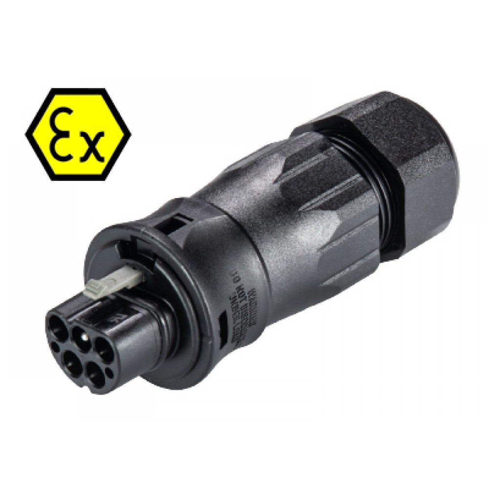 Взрывозащищенный вилочный разъем на кабель диам. 13-18 мм, IP68(69k), 5 полюсов, винтовая фиксация провода, номинальные характеристики: 250/400V+РЕ, 20A, цвет: черный, серия RST Ex
