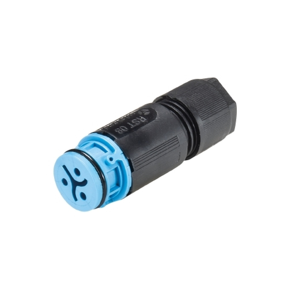 Розеточный разъем на кабель RST08i3/2S 11 ZR1SH BL, Розеточный разъем на кабель диаметром 4-7 мм, 2 полюса, с продольным уплотнением, тип фиксации провода: винтовой, номинальные характеристики: 250/400V, 8A, цвет корпуса: черный, цвет контактной вставки: синий, серия RST MICRO