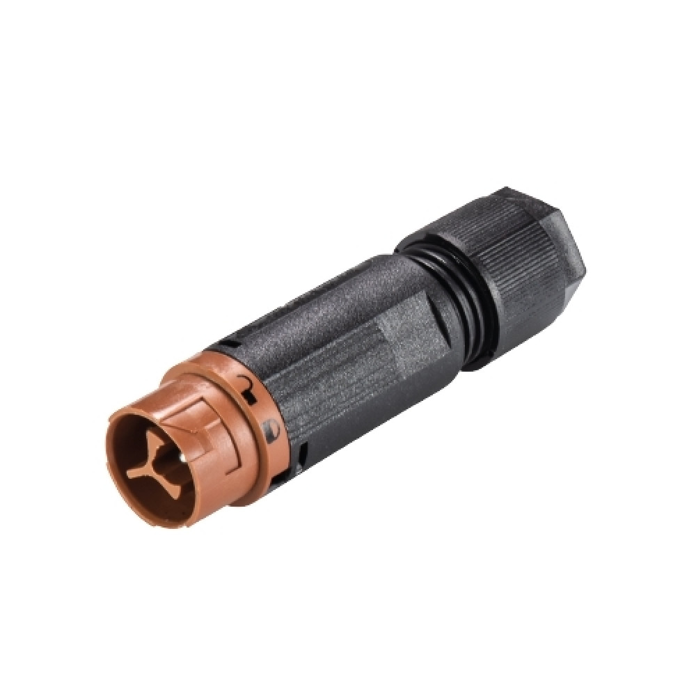 Вилочный разъем на кабель диаметром 5-9,5 мм, 3 полюса, тип фиксации провода: винтовой, номинальные характеристики: ~50/120V, 16A, цвет корпуса: черный, цвет контактной вставки: коричневый, серия RST MINI