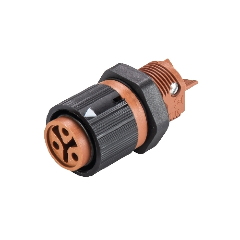 Розеточный разъем в панель, М16, 3 полюса, тип фиксации провода: винтовой, номинальные характеристики: ~50/120V, 16A, цвет корпуса: черный, цвет контактной вставки: коричневый, серия RST MINI