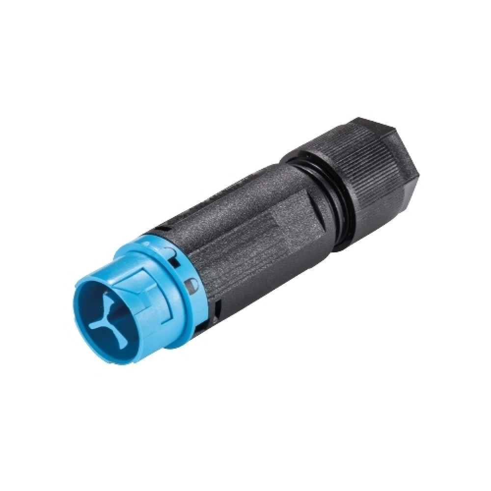 Вилочный разъем на кабель диаметром 5-9,5 мм, 2 полюса, тип фиксации провода: винтовой, номинальные характеристики: 250/400V, 16A, цвет корпуса: черный, цвет контактной вставки: голубой, серия RST MINI
