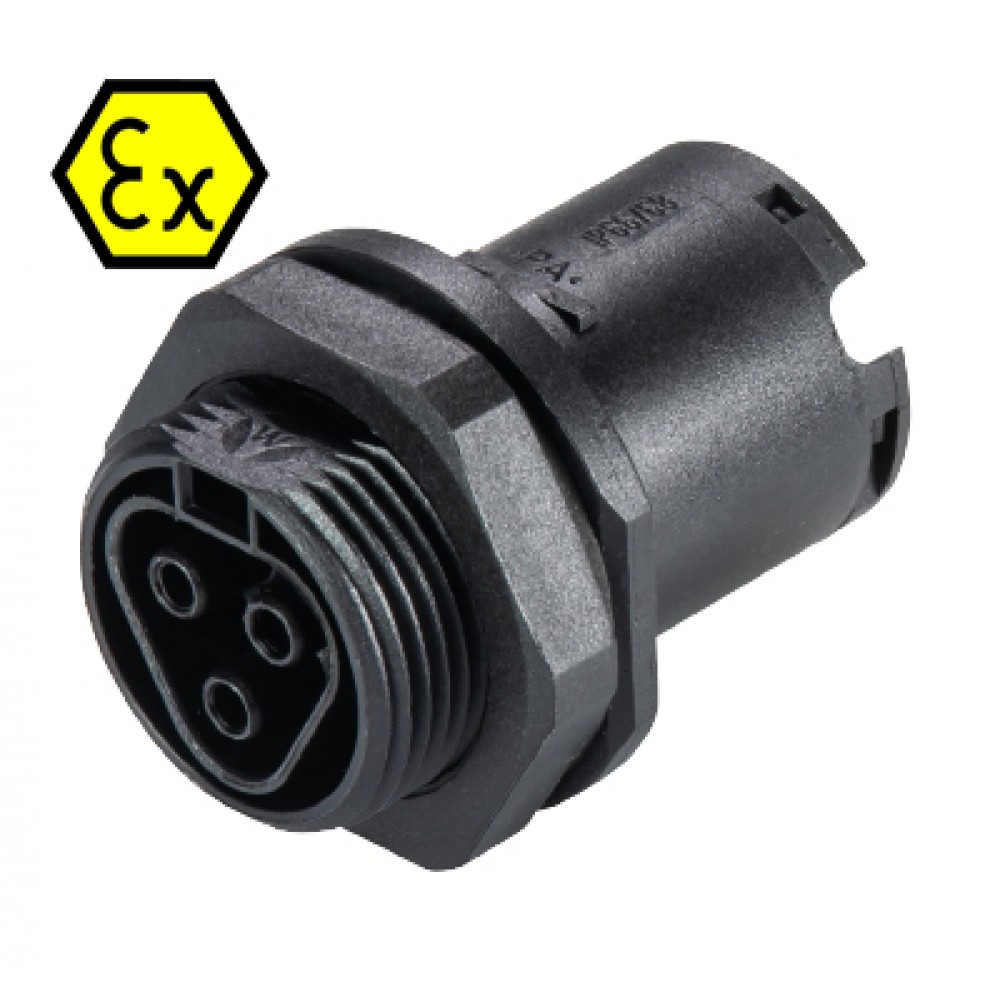 Взрывозащищенный розеточный разъем в панель, М25, IP68(69k), 3 полюса, пружинная фиксация провода, номинальные характеристики: 250/400V, 20A, цвет: черный, серия RST Ex