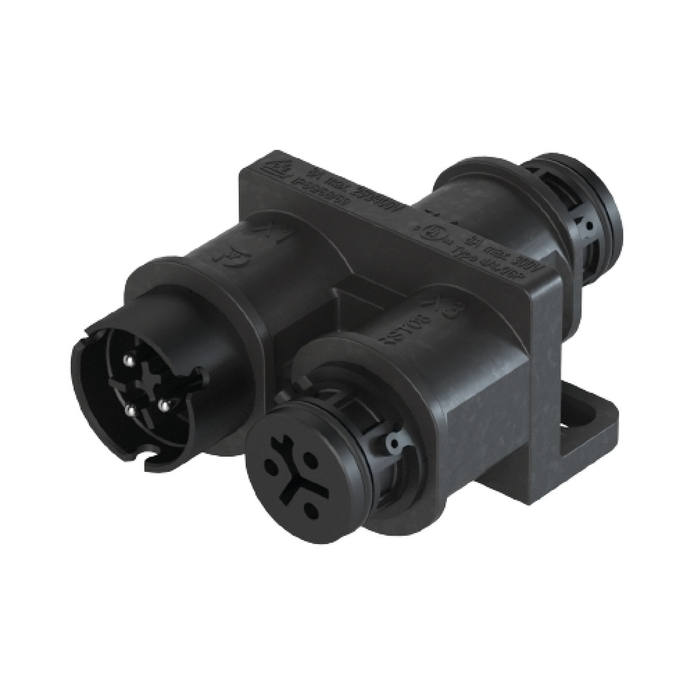 Распределительное устройство RST08i3VL2P1YF V SW, Распределительное устройство (тройник), 1 вход/2 выхода, 3 полюса, параллельное соединение, с продольным уплотнением, с монтажными фланцами, номинальные характеристики: 250/400V, 16A, цвет корпуса: черный, цвет контактной вставки: черный, серия RST MICRO