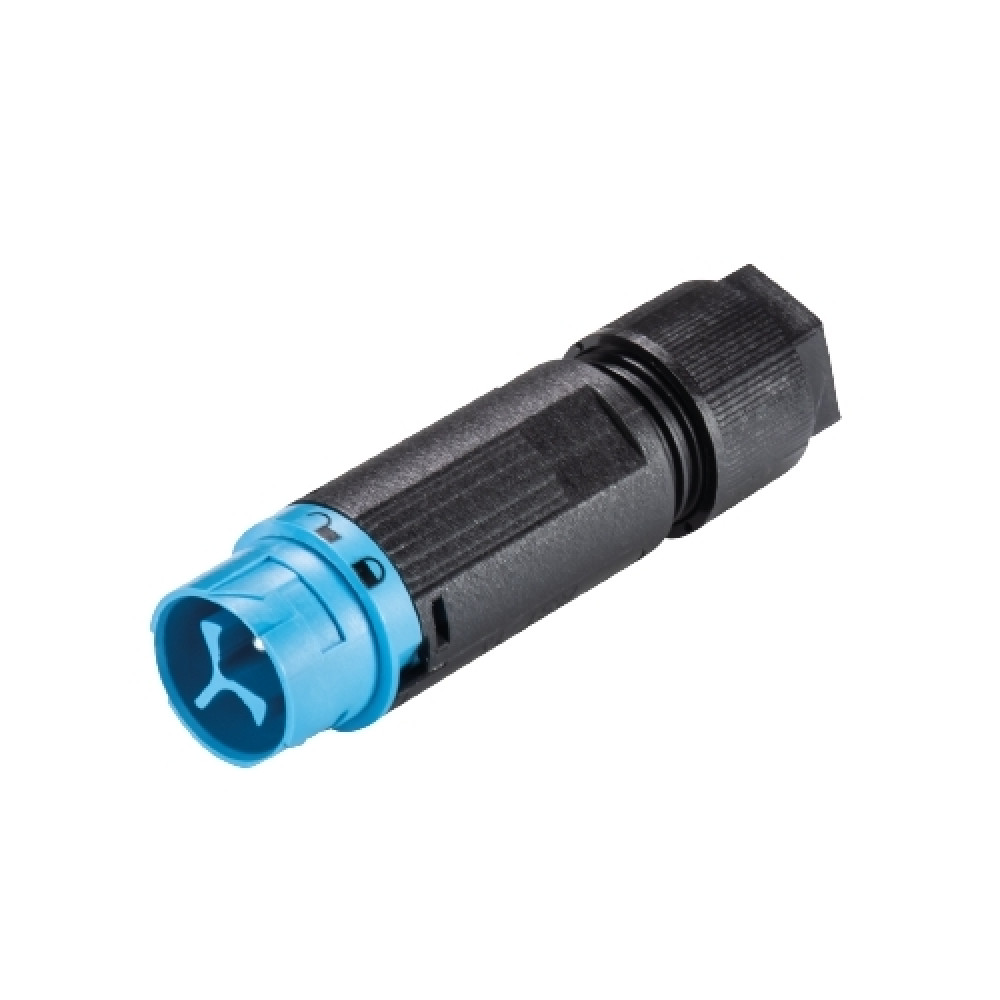Вилочный разъем на кабель диаметром 5-9,5 мм, 3 полюса, тип фиксации провода: винтовой, номинальные характеристики: 250/400V, 16A, цвет корпуса: черный, цвет контактной вставки: голубой, серия RST MINI