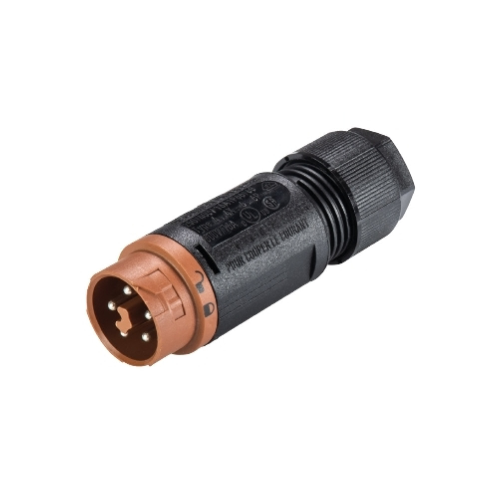 Вилочный разъем на кабель диаметром 7,1-13 мм, 5 полюсов, тип фиксации провода: винтовой, номинальные характеристики: ~50/120V, 16A, цвет корпуса: черный, цвет контактной вставки: коричневый, серия RST MINI