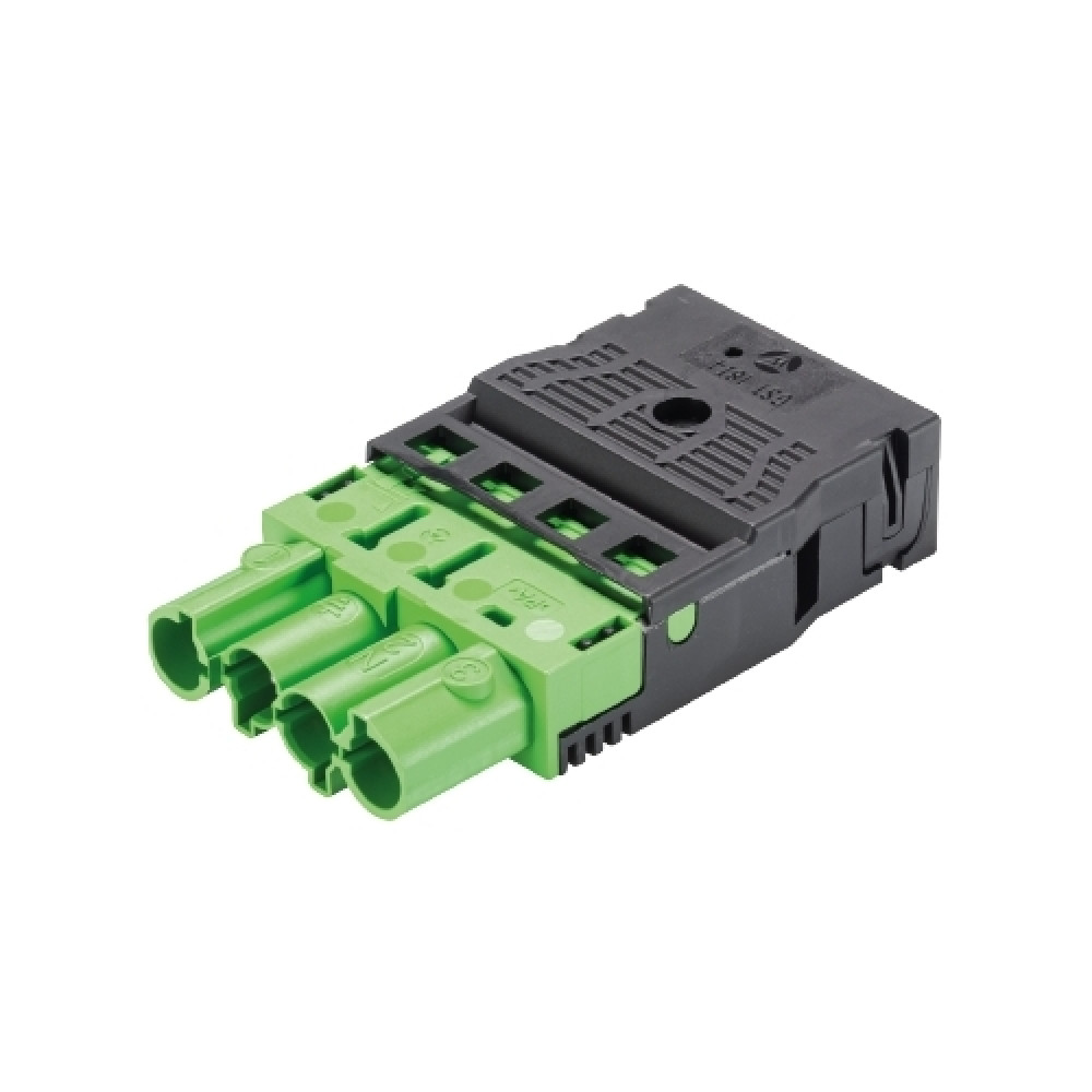 Доставка Вилочный разъем на кабель GST18I4F S2 ZR1 GN02 , Вилочный разъем на кабель диам. 9,5 - 11,5 мм, 4 полюса, пружинная фиксация, номинальное напряжение: 250/400V, номинальный ток: 20A, цвет корпуса: черный, цвет контактной вставки: зеленый, серия gesis GST18i4
