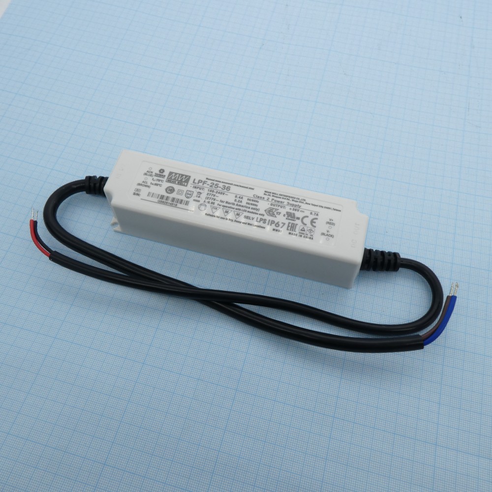 LPF-25-36, AC-DC, 25Вт, вход 90…305В AC, 47…63Гц /127…431В DC, выход 36В/0.7А, ККМ, изоляция 3750В AC, IP67, в кожухе 148х40х32мм, -40…+70°С