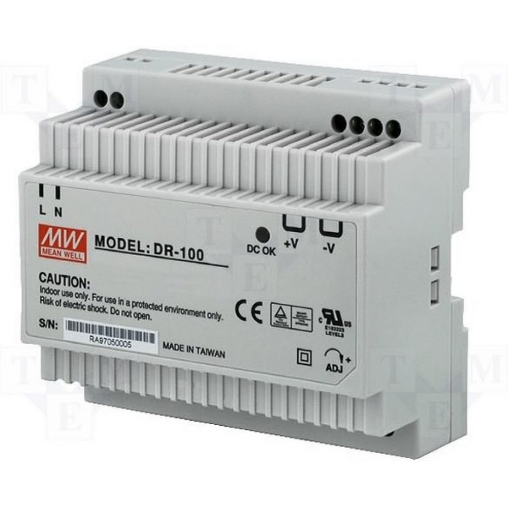 Доставка DR-100-24 , Преобразователь AC-DC на DIN-рейку 100Вт, выход 24В/5A, рег. вых=±10%Uном, вход176…264V AC, 47…63Гц /254…370В DC, изоляция 3000В AC, в кожухе 100х66х125мм, -10…+50°С