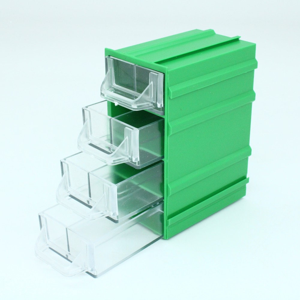 Состоит из 4х выдвижных лотков, объединённых одним корпусом. Каждый лоток разделён на две части, для увеличения хранения типов комплектующих. Таким образом, Вы получаете 8 ячеек в 4 контейнерах. На задней части корпуса расположены крепёжные отверстия, с помощью которых контейнер можно легко прикрепить к стене. В ручках лотков предусмотрен отсек для бирки, на которых можно перечислить ассортимент хранимого в данном контейнере. Контейнеры собираются между собой с помощью ласточкина хвоста. Таким образом, из них можно собрать стойку любого размера. Стыкуется с контейнерами К3, К4, К5, К5-В2, К5-П1, К5-П2, К6, К7.