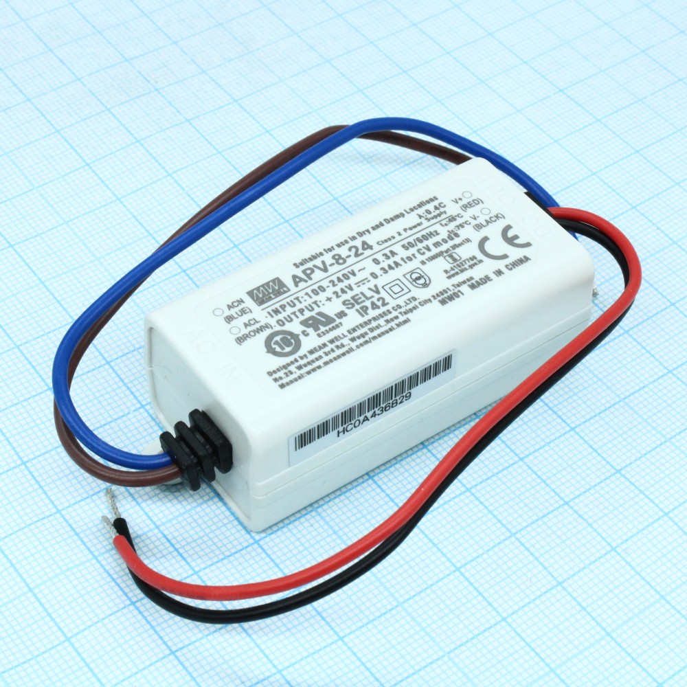 APV-8-24, AC-DC, 8Вт, вход 90…264В AC, выход 24В/0.34А, изоляция 3750В AC, в кожухе 60х30х23.5мм, -30…+70°С
