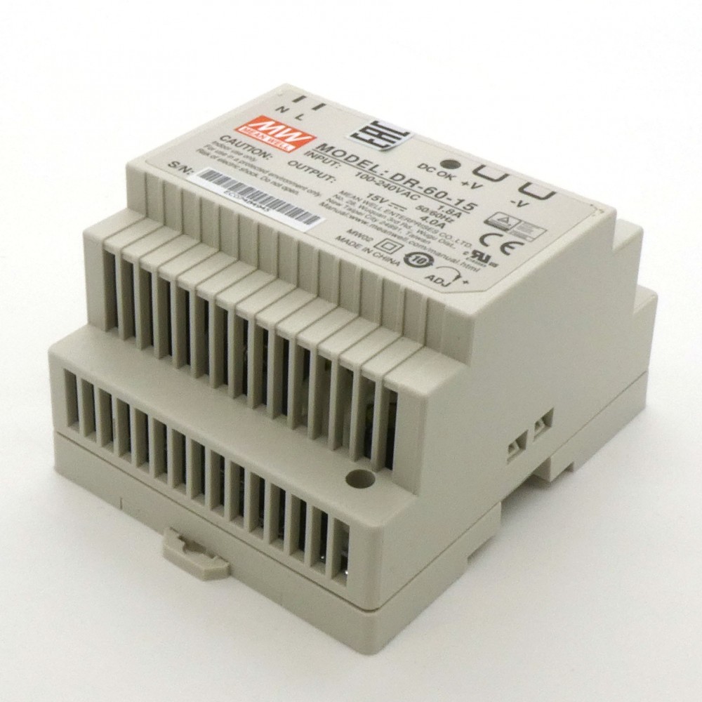 DR-60-15, AC-DC, 60Вт, вход 85...264 В AC 47...63Гц/120...370В DC, выход 15В/4А, изоляция 3000В AC, в кожухе на DIN-рейку, 52.5х90х54.5мм, -30...+70°С