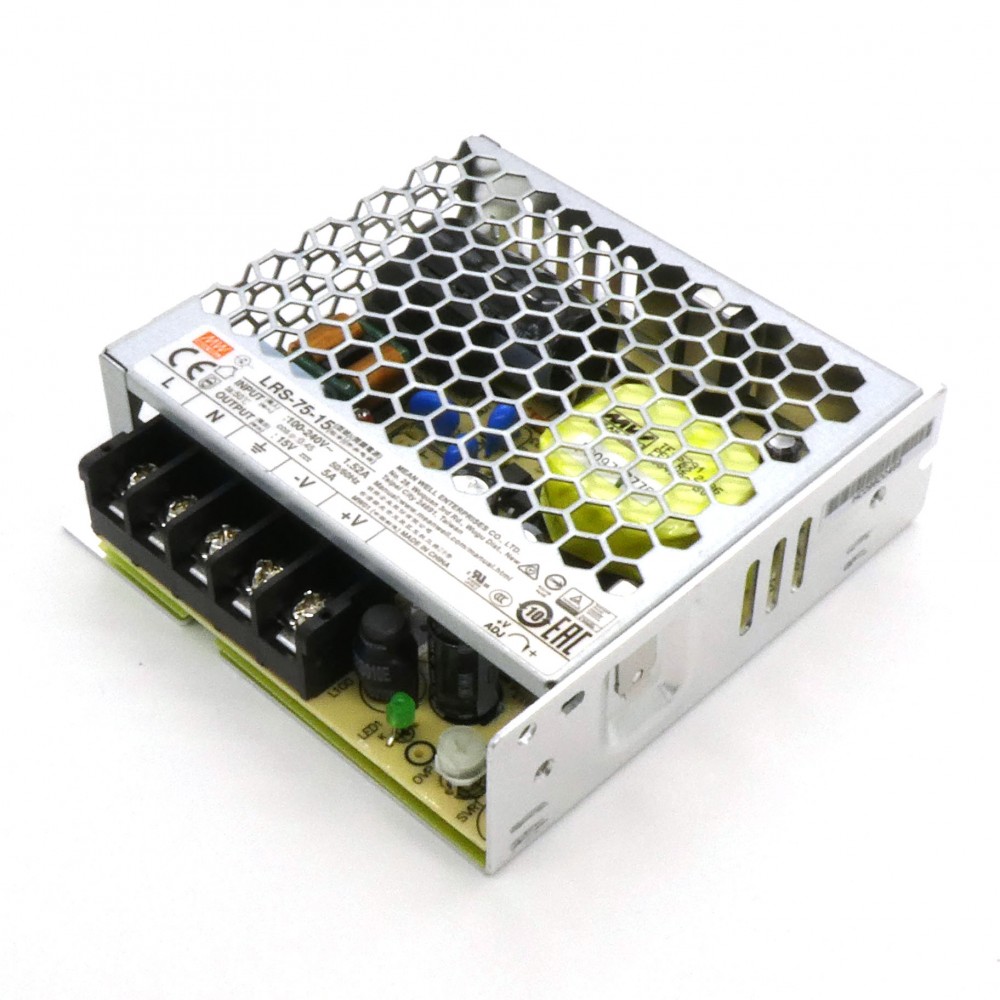LRS-75-15, AC-DC, 75Вт, вход 85…264В AC, 47…63Гц / 120…370 В DC, выход 15В/5A, рег. вых ±10% , изоляция 3750В AC, в кожухе 99х97х30мм, -30…+70°С