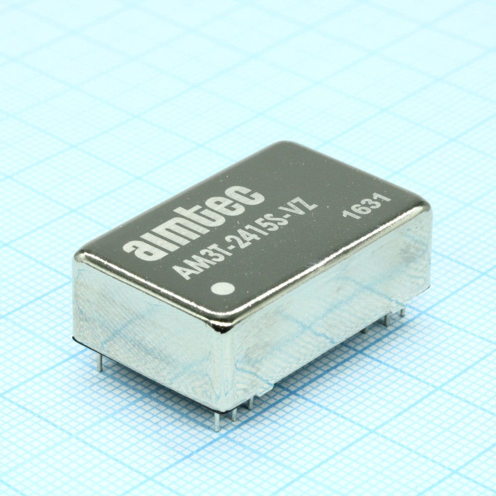 AM3T-2415S-VZ, DC/DC, 3Вт, вход 18…36В, выход 15В/0.2А, изоляция 1500В DC, КПД 82%, максимальная емкостная нагрузка не более 470мкФ, DIP24, 31.75x20.32x10.16мм, -40…85°C, металл