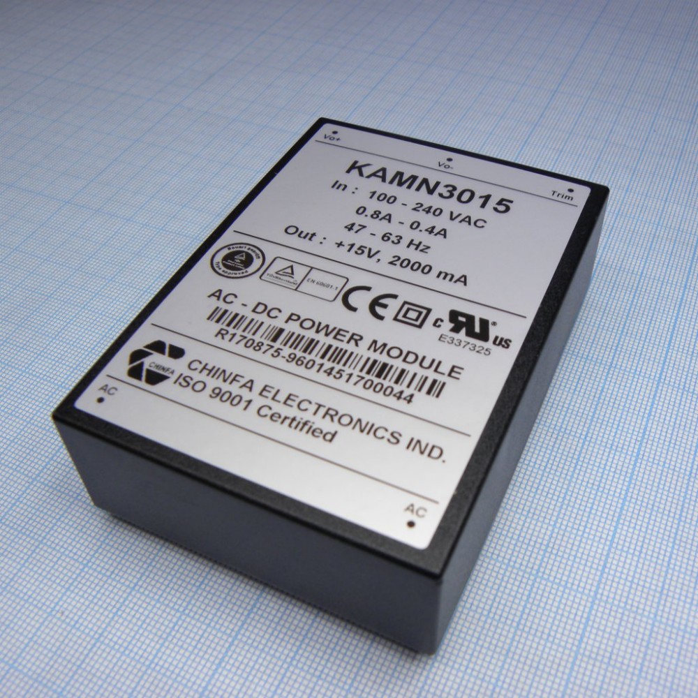 KAMN3015, AC-DC, 30Вт, вход 85…265V AC, 47…63Гц / 120...370V DC, выход 15В/2A, рег. вых=±10%Uном, изоляция 4000V AC, в кожухе 89х64х33мм, -40…+61°С