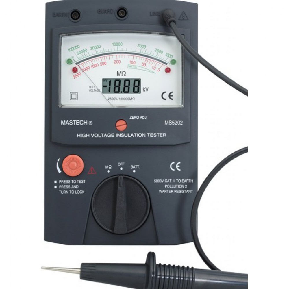 Цифро-аналоговый мегоомметр Mastech MS5202 служит для измерения сопротивления изоляции токонесущих элементов электросетей, находящихся под большим напряжением. Он полностью соответствует требованиям международного стандарта IEC1010-1 CAT II 5000V. Прибор имеет большой стрелочный индикатор с зеркальной шкалой, которая служит для повышения точности измерений и цифровой дисплей, служащий для индикации выходного напряжения.