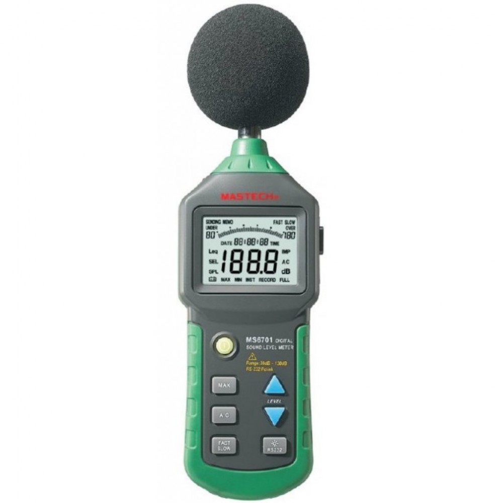 Цифровой шумомер Mastech MS6701 позволяет измерять уровень громкости звука и шумов в большом диапазоне и с высокой точностью. Отличается от модели MastechMS6701 наличием в комплекте поставки программного обеспечения для записи результатов измерения на компьютер и дальнейшей их обработки, а так же функцией памяти на 16000 записей значений измерений. Прибор имеет специальный измерительный микрофон, обладающий очень малой неравномерностью АЧХ и высокой чувствительностью, усилитель, корректирующий фильтр и большой ЖК-дисплей для отображения полученных результатов измерения.