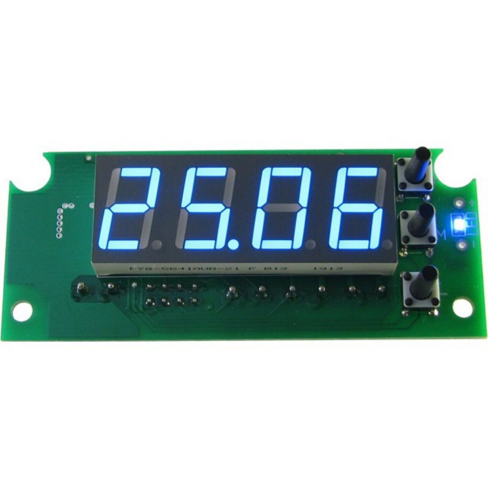 Модуль предназначен для самостоятельной сборки блока индикации температуры и управления внешним устройством в зависимости от температуры. Модуль состоит из модуля индикации, управляющих кнопок и выносного датчика температуры DS18B20 на кабеле. Для подключения питания, внешних устройств и датчика температуры установлены клеммники под отвертку. На печатной плате имеется контактная точка OUT, соединенная с выводом 9 микроконтроллера (PD5/OC0B). На плате установлен светодиод, отображающий состояние реле (выключенный светодиод - реле отключено*). Кроме того, на плате имеется два контактных отверстия для подключения внешнего светодиода, при необходимости.