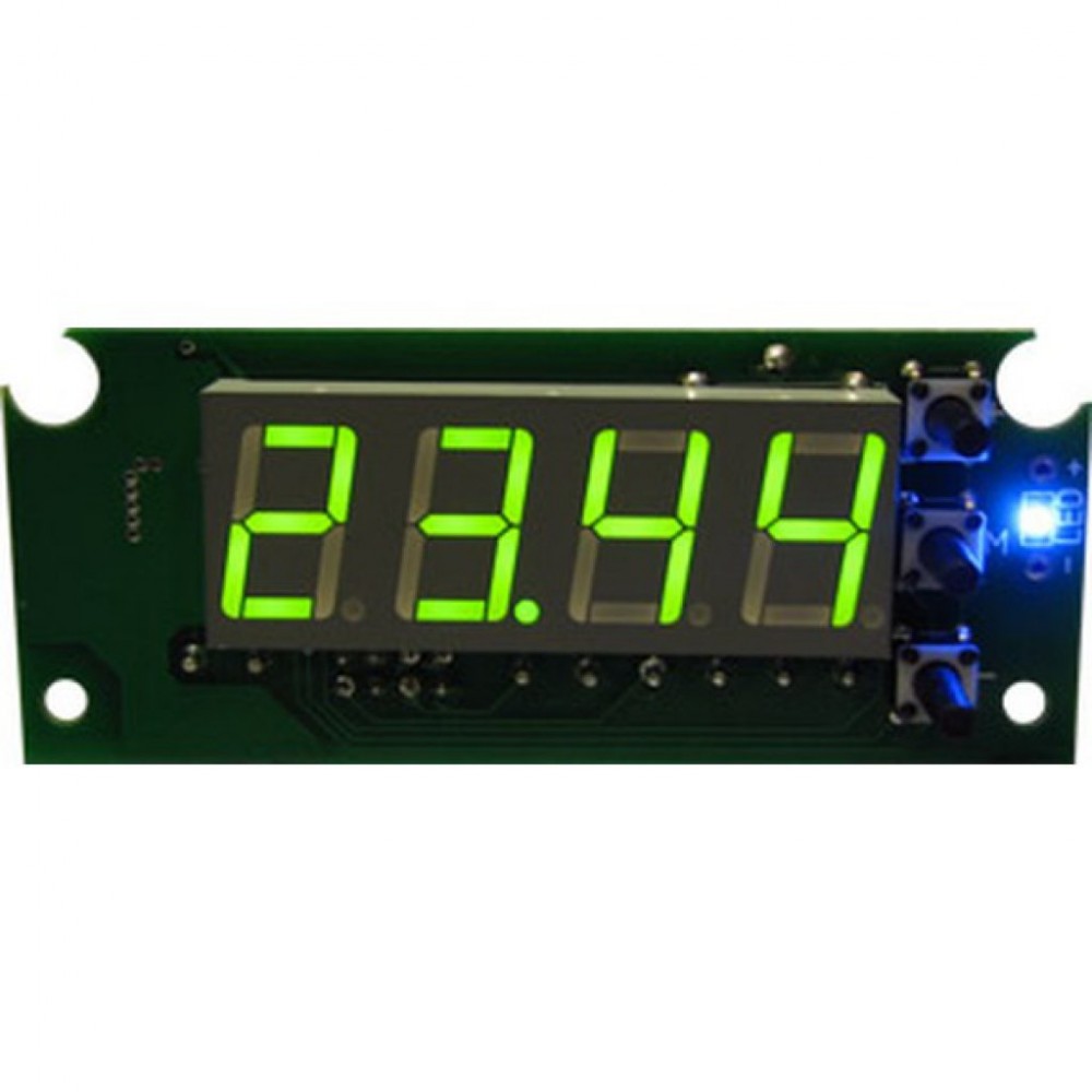Модуль предназначен для самостоятельной сборки блока индикации температуры и управления внешним устройством в зависимости от температуры. Модуль состоит из модуля индикации, управляющих кнопок и выносного датчика температуры DS18B20 на кабеле. Для подключения питания, внешних устройств и датчика температуры установлены клеммники под отвертку. На печатной плате имеется контактная точка OUT, соединенная с выводом 9 микроконтроллера (PD5/OC0B). На плате установлен светодиод, отображающий состояние реле (выключенный светодиод - реле отключено*). Кроме того, на плате имеется два контактных отверстия для подключения внешнего светодиода, при необходимости.