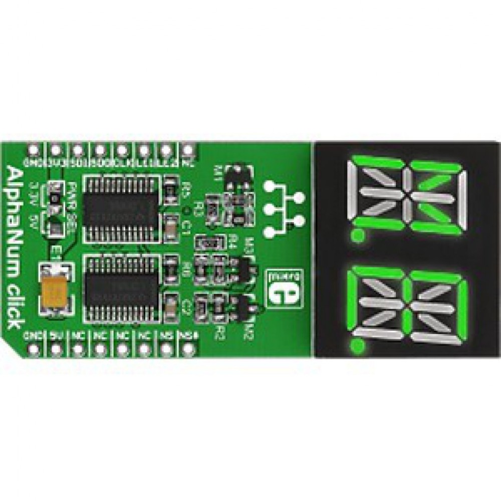 AlphaNum G click - это плата расширения форм-фактора mikroBUS, простое решение для добавления вашим проектам 14-сегментного буквенно-цифрового дисплея. Плата построена на базе двух светодиодных драйверов TLC5926 и двойного светодиодного 14-сегментного дисплея зеленого свечения (с двумя дополнительными сегментами для запятой). Рабочее напряжение платы 3.3В или 5В.