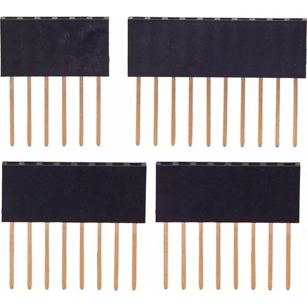 Набор из оригинальных контактных колодок Arduino состоит из 6-контактной, 10-контактной и двух 8-контактных колодок. Это соответствует распределению контактов на Arduino Uno R3, большинстве плат расширения.