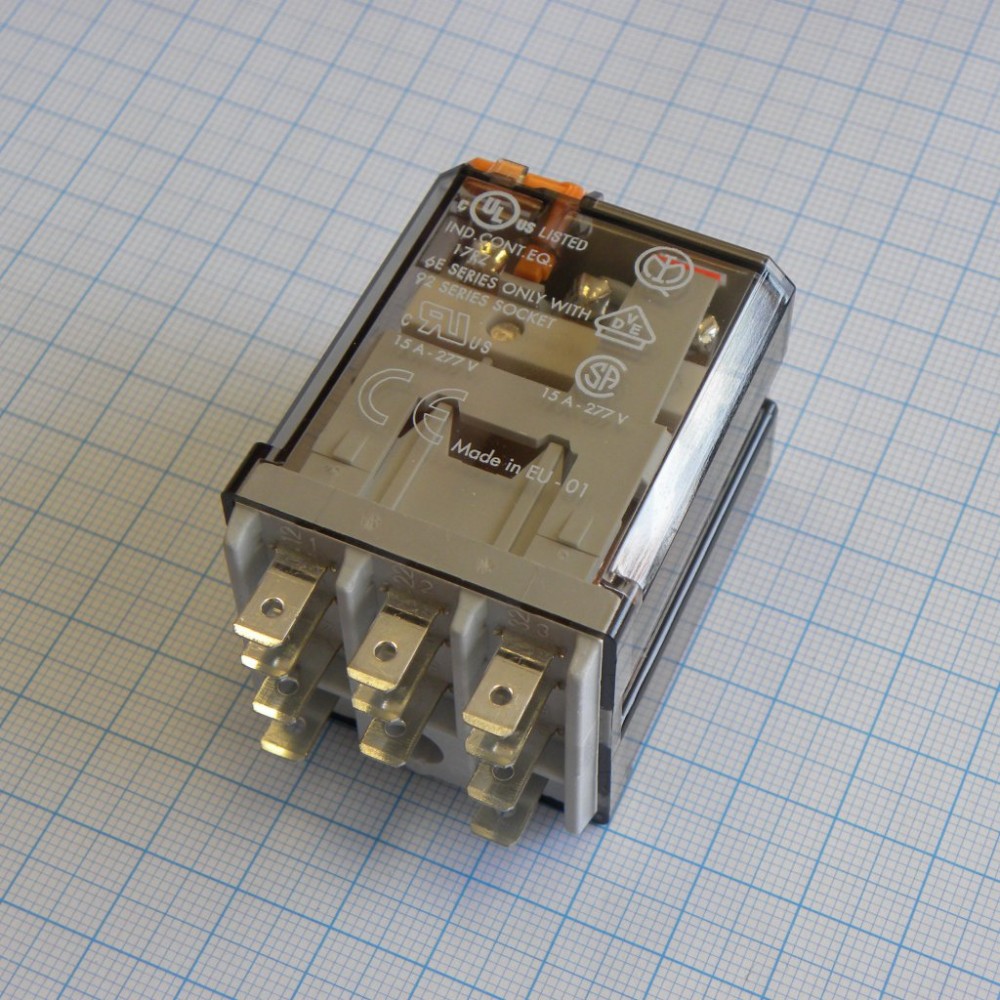 Силовое электромеханическое реле; монтаж в розетку или наконечники Faston 187 (4.8х0.5мм); 3CO 16A; контакты AgCdO; катушка 110В AC; степень защиты RTI; опции: кнопка тест + мех.индикатор