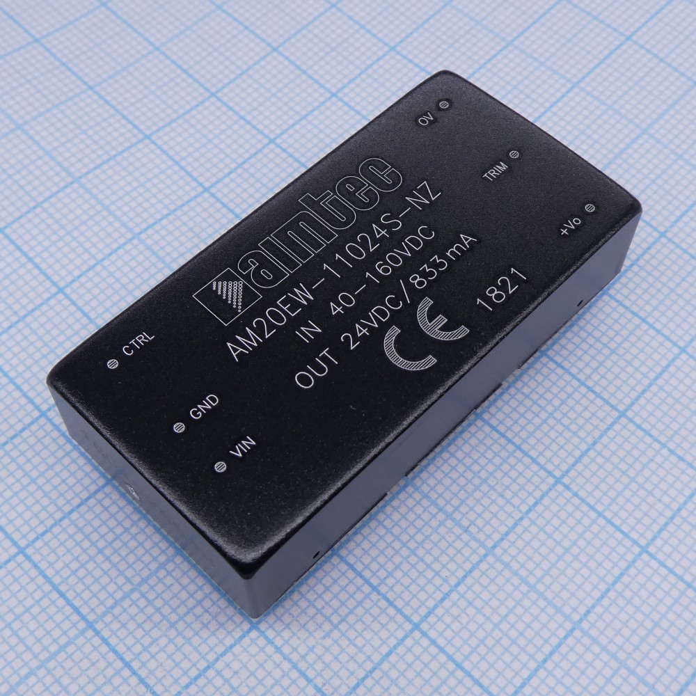 AM20EW-11024S-NZ, DC/DC, 20Вт, вход 40…160В, выход 24В/0.833А, изоляция 1500В DC, КПД 88%, максимальная емкостная нагрузка не более 470мкФ, вход On/Off, 2x1", 50.8x25.4x11.8мм, -40…85°C, металл