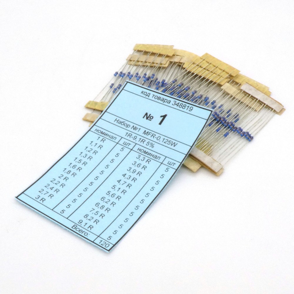 Набор резисторов №1 MFR-12J(F) 1-9.1, Набор выводных резисторов 0.125W, ряд Е24 ( по 5 шт.) номиналы 1-9,1 Ом, 5%(1%)