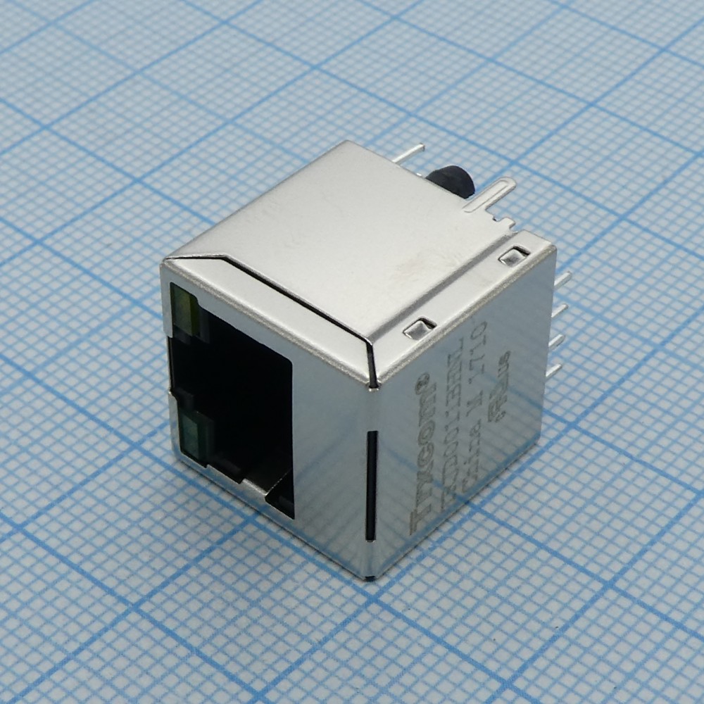 Разъем экр. "гнездо" RJ-45 c согласующ. фильтром 10/100Base-TX (1:1), вертик. на плату, 2 светодиод. (зеленый/желтый), без лепестков, 0...+70°С