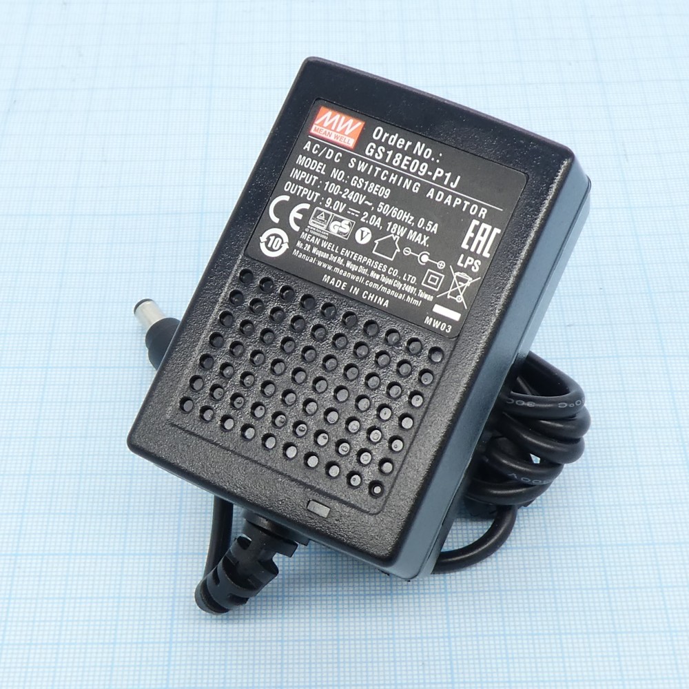GS18E09-P1J, AC-DC, 18Вт, вход 90...264B AC 47...63 Гц, 135...370B DC, выход 9B/2A, изоляция 4242B AC, настенный, 79x54x33мм, 0...+50°С, двухполюсная евровилка, выходной разъем 11мм, диам. 5.5х2.1мм