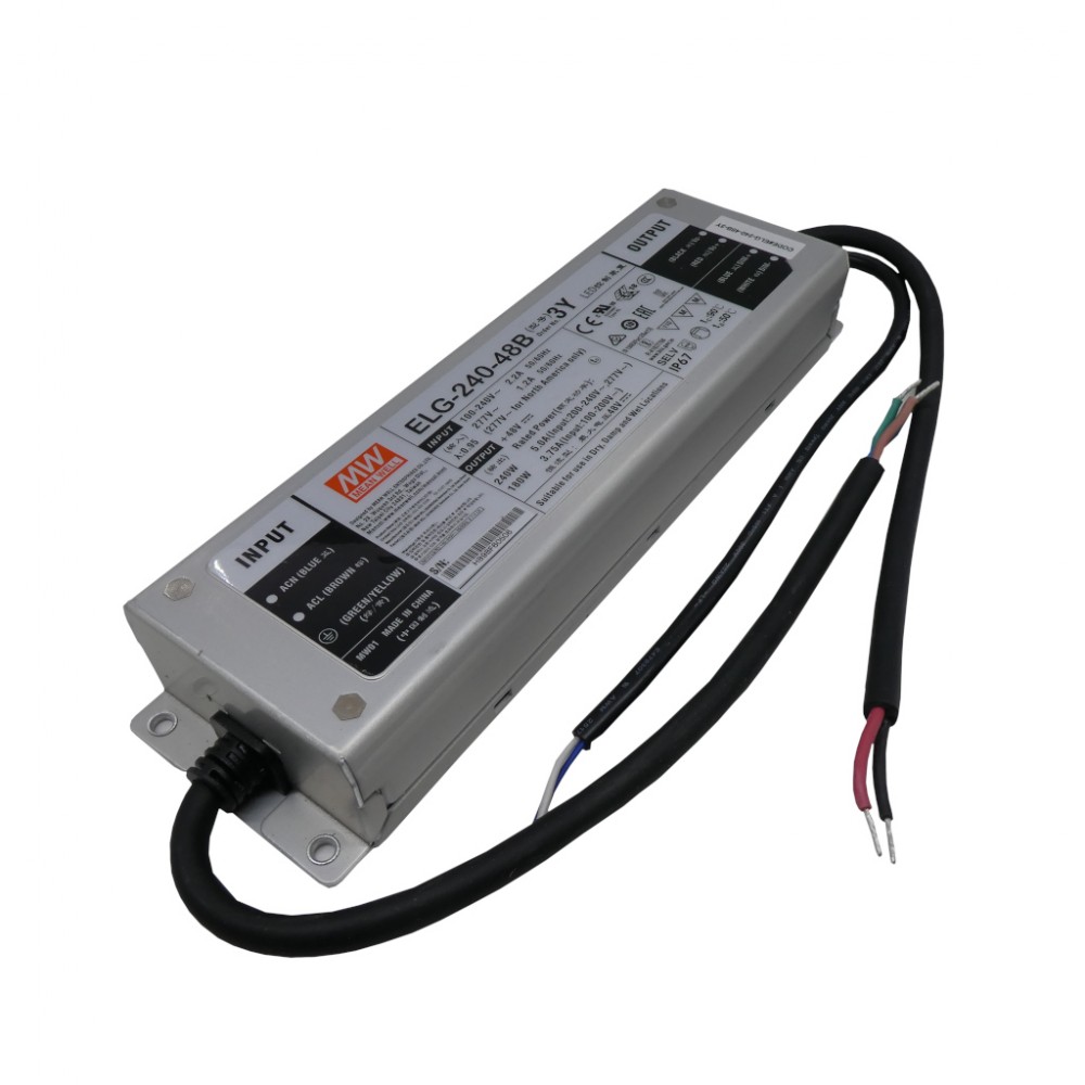 ELG-240-48B-3Y, AC-DC, 240Вт, IP67, вход 100…305В AC, 47…63Гц/142…431В DC, ККМ, выход 24...48В/5А, изоляция 3750В AC, в кожухе 244х71х37.5мм, -40…+85°С (корпус), димминг 3 в 1, провод заземления