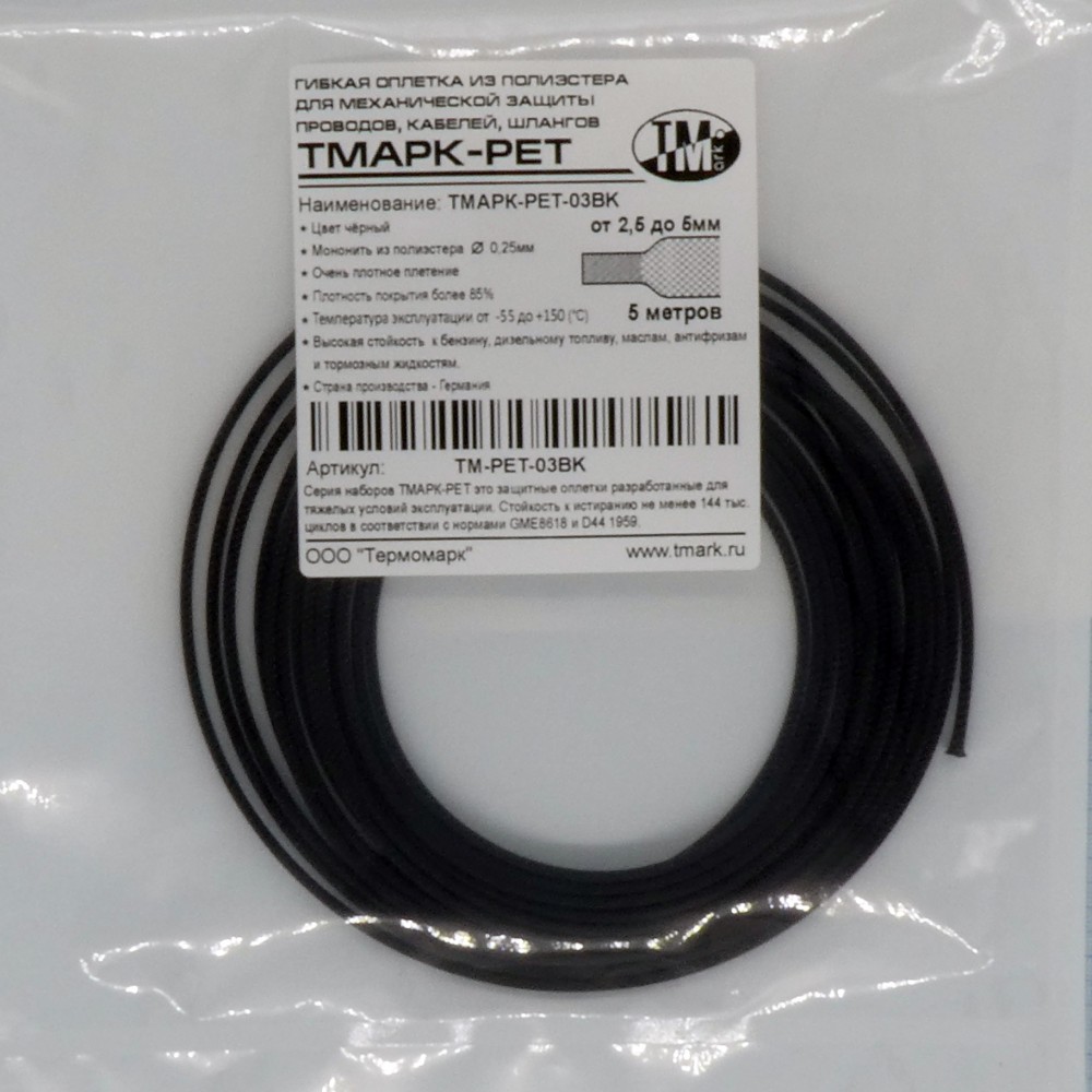 Оплетка защитная TMAPK-PET-03BK 3мм, Гибкая оплетка из полиэстера для механической защиты проводов, кабелей, шлангов. Диаметр от 2.5мм до 5мм, t=от -55 до +150 градусов. Стойкость к бензину, дизельному топливу, маслам, антифризам