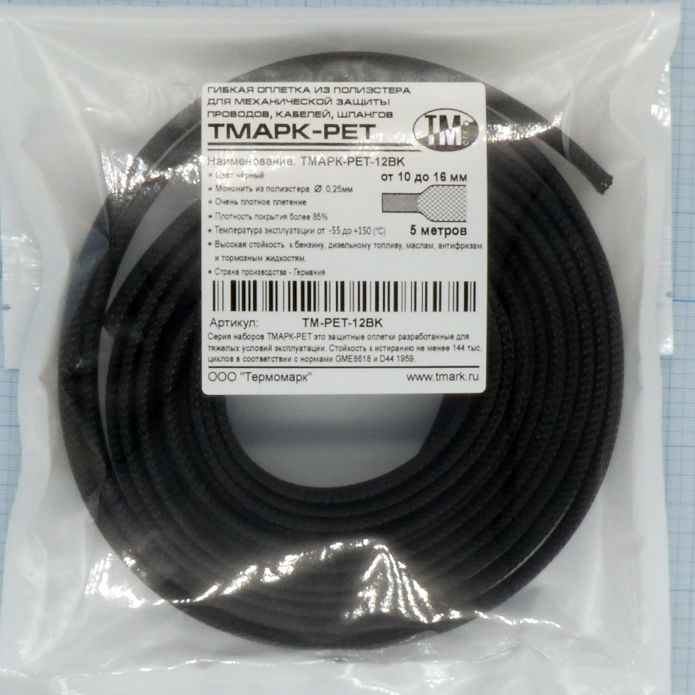 Оплетка защитная TMAPK-PET-12BK 12мм, Гибкая оплетка из полиэстера для механической защиты проводов, кабелей, шлангов. Диаметр от 10мм до 16мм, t=от -55 до +150 градусов. Стойкость к бензину, дизельному топливу, маслам, антифризам