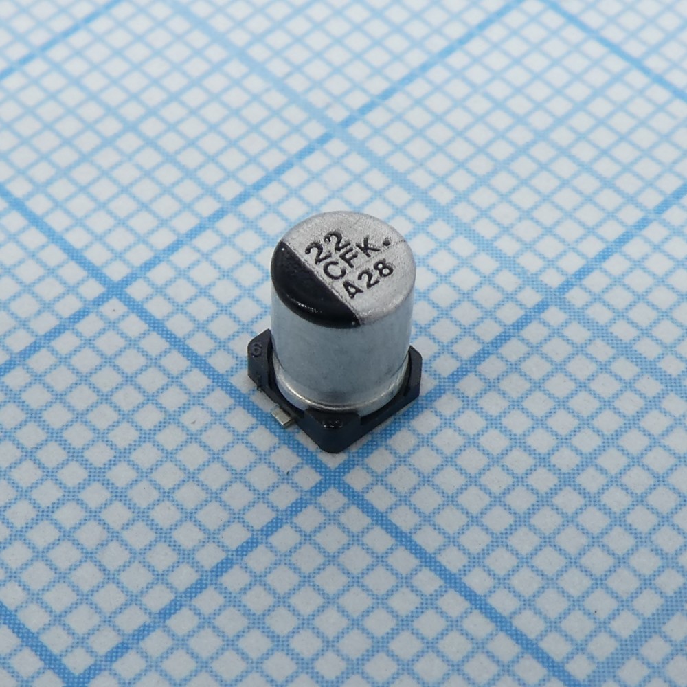 Конденсатор алюминиевый электролитический 22мкФ 16В ±20% (4 X 5.8мм) для поверхностного монтажа 90мА 2000час 105°С автомобильного применения лента на катушке