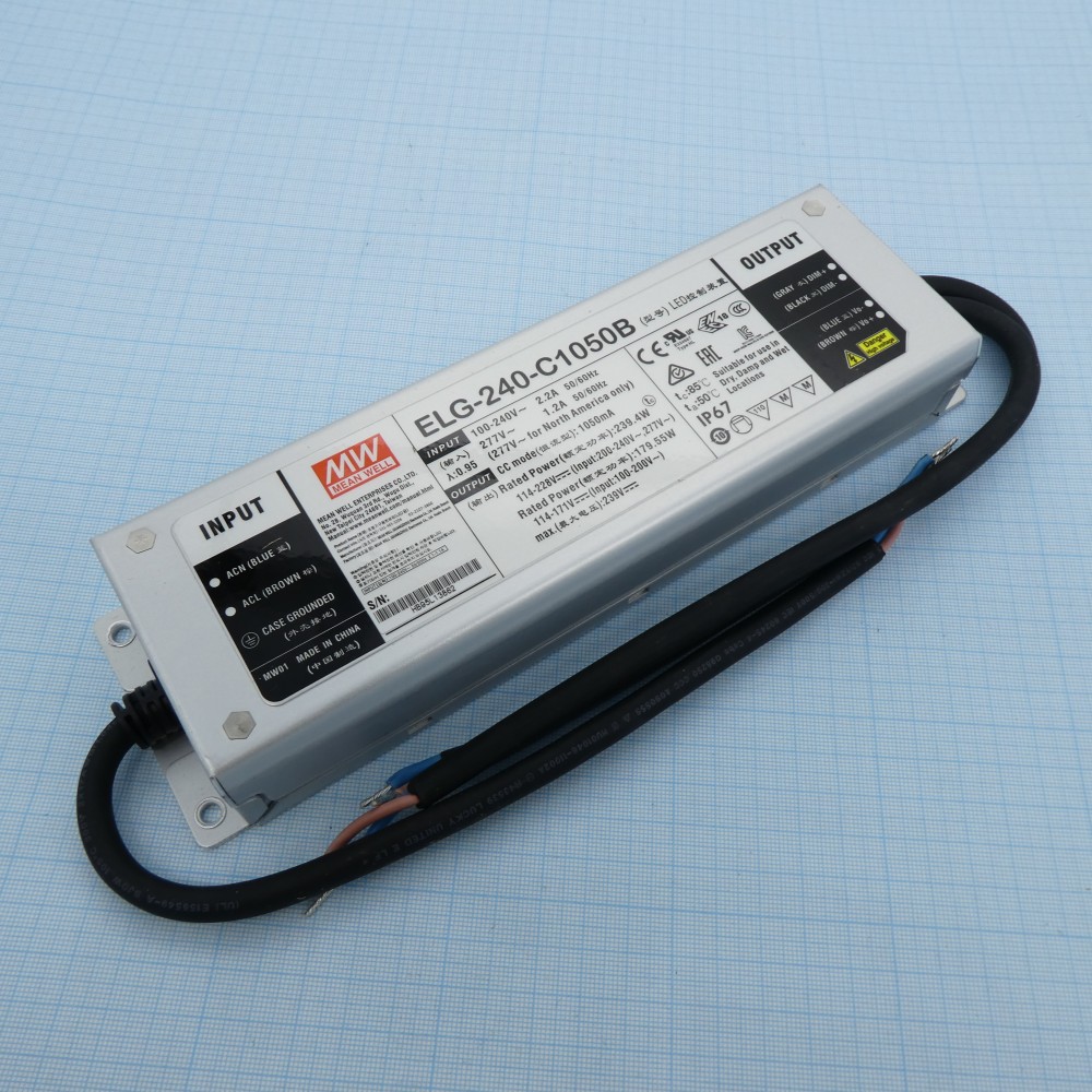 ELG-240-C1050B, AC-DC, 240.1Вт, IP67, вход 100…305В AC, 47…63Гц/142…431В DC, ККМ, выход 114...228В/1050мА, изоляция 3750В AC, в кожухе 244х71х37.5, -40…+85°С (корпус), димминг 3 в 1
