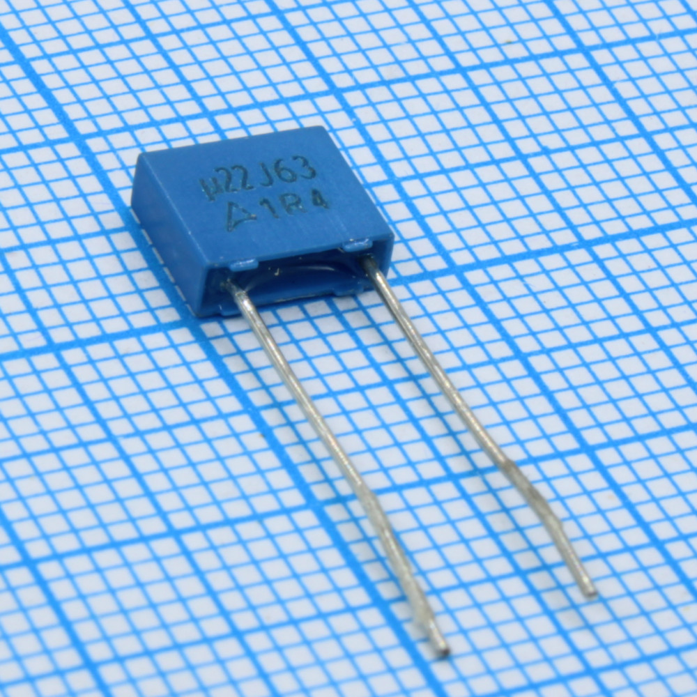 Конденсатор металлоплёночный полиэтилентерефталатный 0.22мкФ 63В ±5% (7.3х2.5х6.5мм) шаг выводов 5мм 125°С автомобильного применения россыпь
