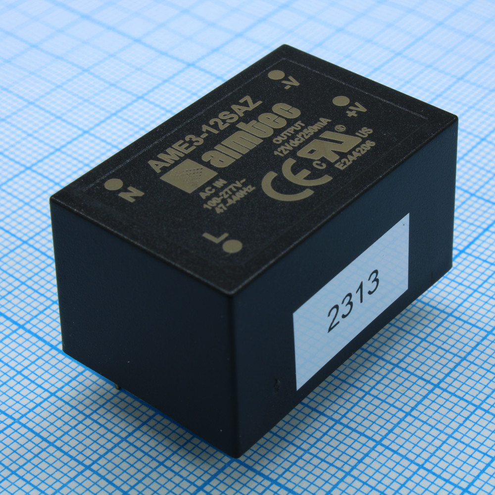 AME3-12SAZ, AC/DC, 3Вт, вход 90…305В, выход 12В/0.25А, изоляция 3000В AC, КПД 73%, максимальная емкостная нагрузка не более 680мкФ, 35.6x23.31x19.32мм, -40…80°C, пластик
