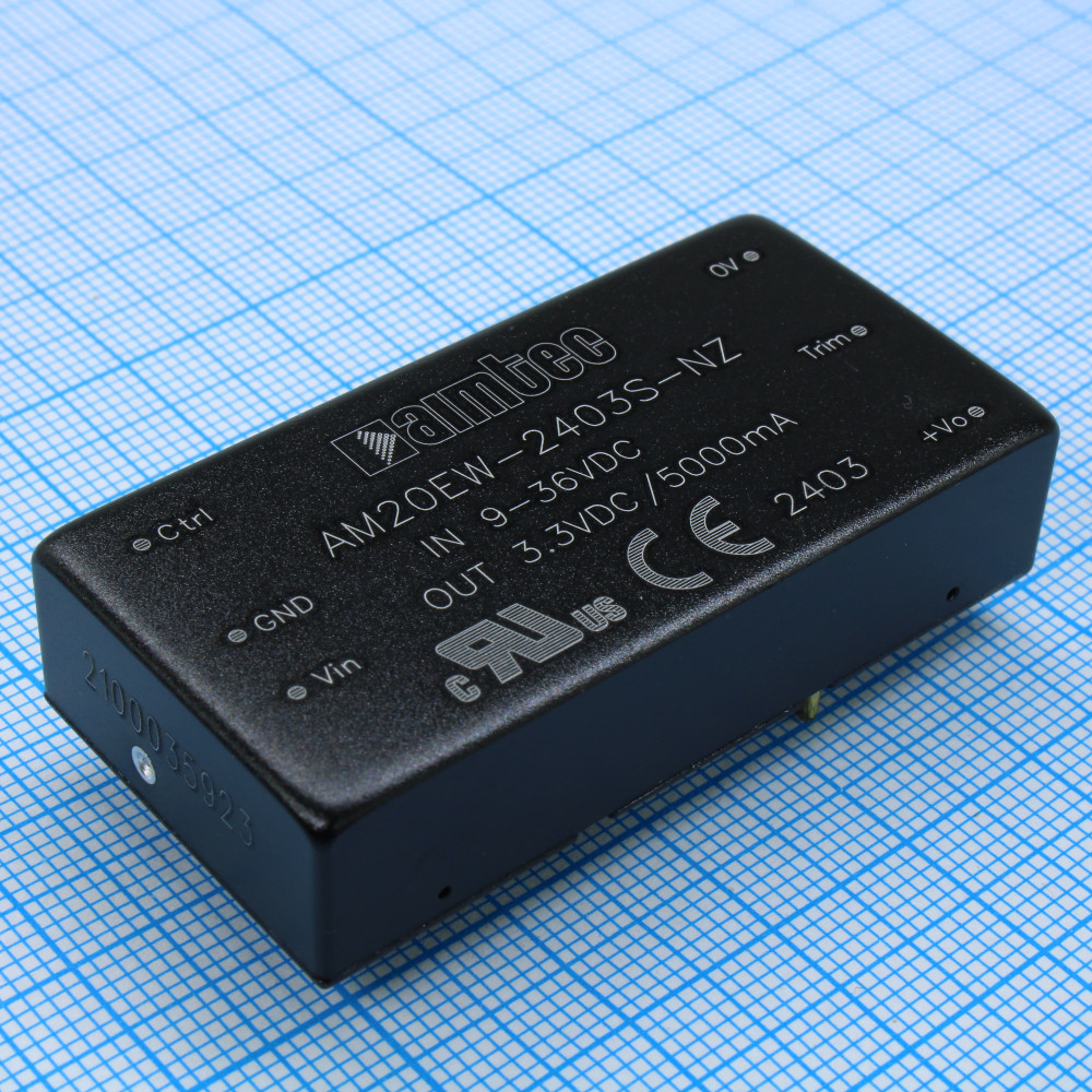 AM20EW-2403S-NZ, DC/DC, 20Вт, вход 9…36В, выход 3.3В/5А, изоляция 1500В DC, КПД 86%, максимальная емкостная нагрузка не более 10000мкФ, вход On/Off, 2x1", 50.8x25.4x11.8мм, -40…85°C, металл