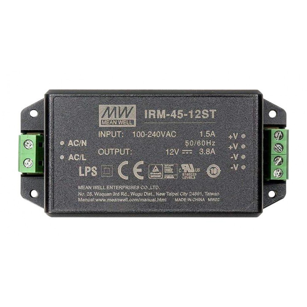 IRM-45-12ST, AC-DC, 45.6Вт, вход 85...305В AC 47...440 Гц, 120...430B DC, выход 12В/3.8А, изоляция 3000В AC, в корпусе на шасси, 109x52x33.5мм, -30...+70°C, винтовые зажимы