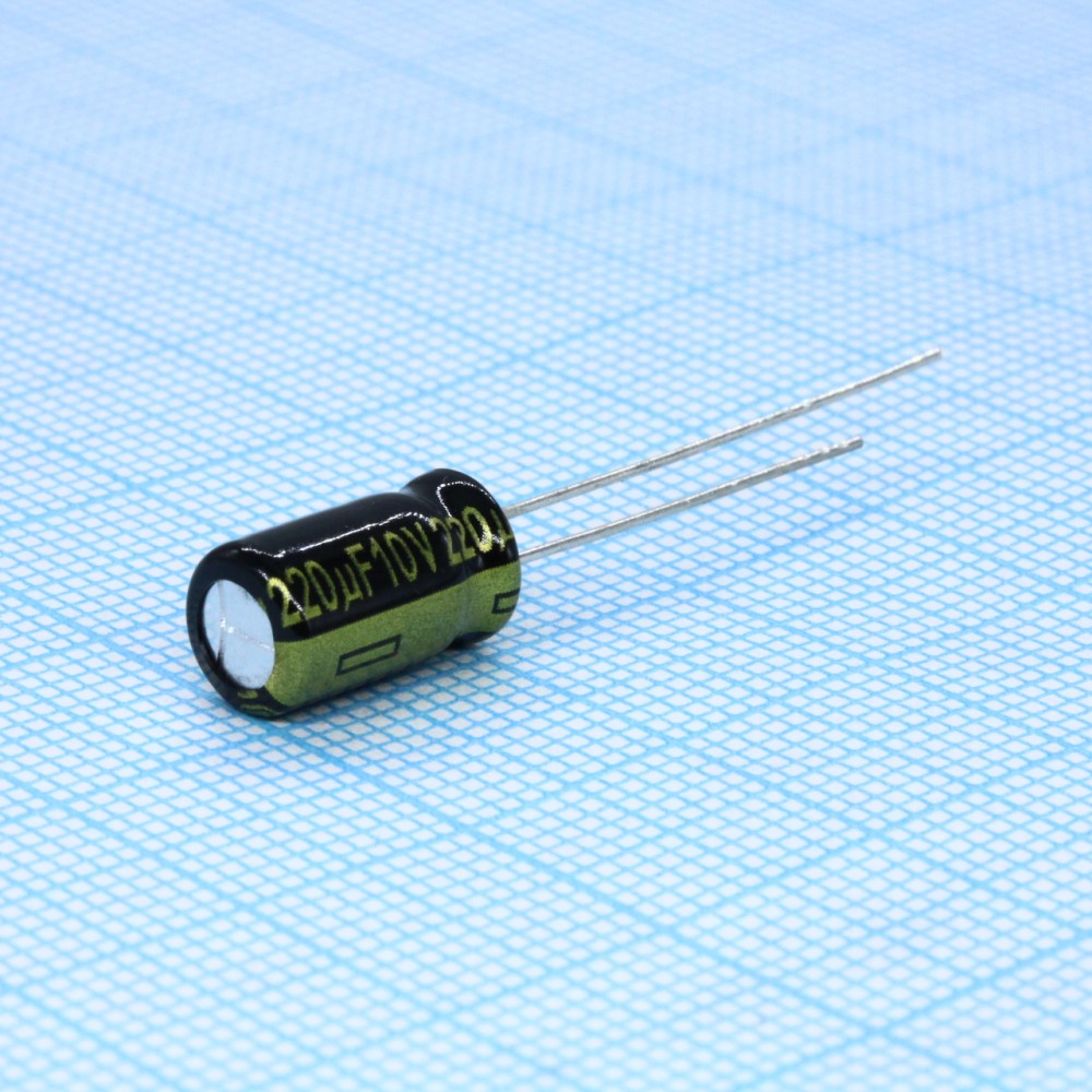 Конденсатор алюминиевый электролитический 220мкФ 10В 20% (6.3 X 11.2мм) радиальные выводы 2.5мм 455мА 2000час 105°С Россыпь