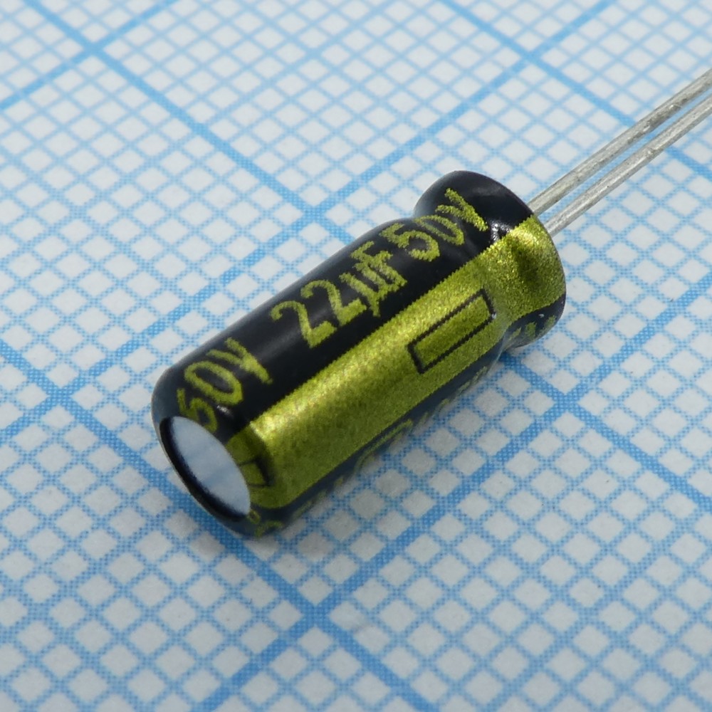 Конденсатор алюминиевый электролитический 22мкФ 50В 20% (5 X 11мм) радиальные выводы 2мм 250мА 2000час 105°С Россыпь