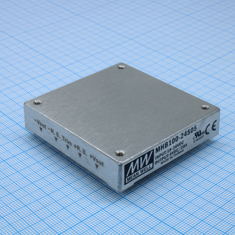 Доставка MHB100-24S05 , Преобразователь DC/DC, 100Вт, вход 18…36В, выход 5В/20А, рег.выхода ±10%, КПД 84%, до 20000мкФ, On/Off, изоляция 1500В DC, в корпусе на плату, Half-Brick, 57.9х61x12.7мм, -40…+100°С